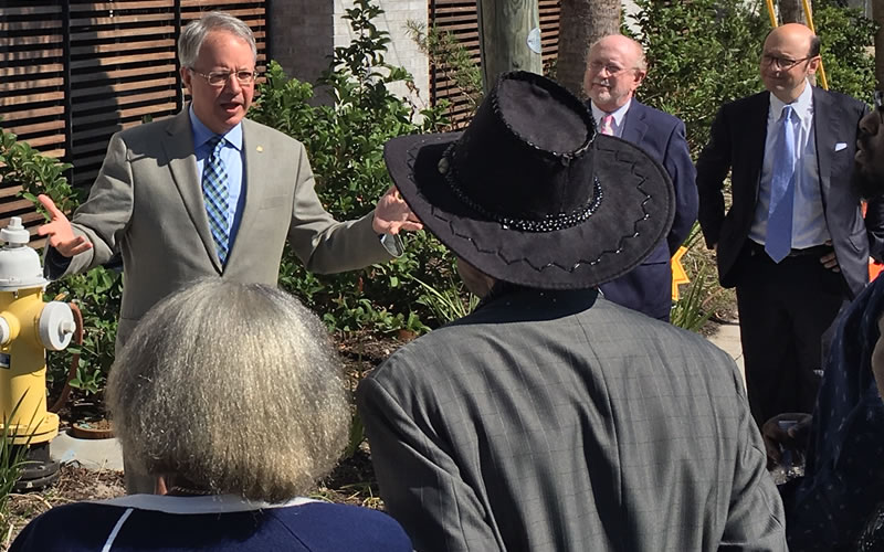 Mayor John Tecklenburg, left, speaks at an event earlier this month at Williams Terrace. At right are Charleston Housing Authority Executive Director Don Cameron and the agency’s board chair, Edward Kronsberg.